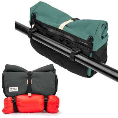 L’avantage de cette sacoche de guidon est qu’elle possède une fixation universelle. Elle se fixe sur quasiment tous les guidons grâce à ses deux sangles réglables (à noter qu’une troisième attache permet de stabiliser la sacoche au niveau de la potence). Ces mêmes sangles ont une double utilité et peuvent également servir pour fixer un sac de couchage sous la sacoche par exemple afin de ne pas perdre de place à l’intérieur de votre sac.