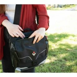 Une fois descendu du vĂ©lo, la sacoche se transporte tout aussi aisĂ©ment grâce Ă sa lanière dĂ©tachable et ajustable, ainsi qu’une anse de transport.